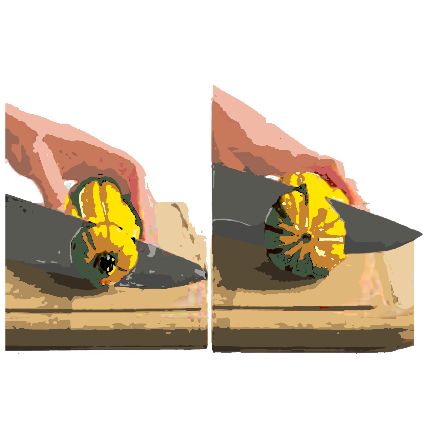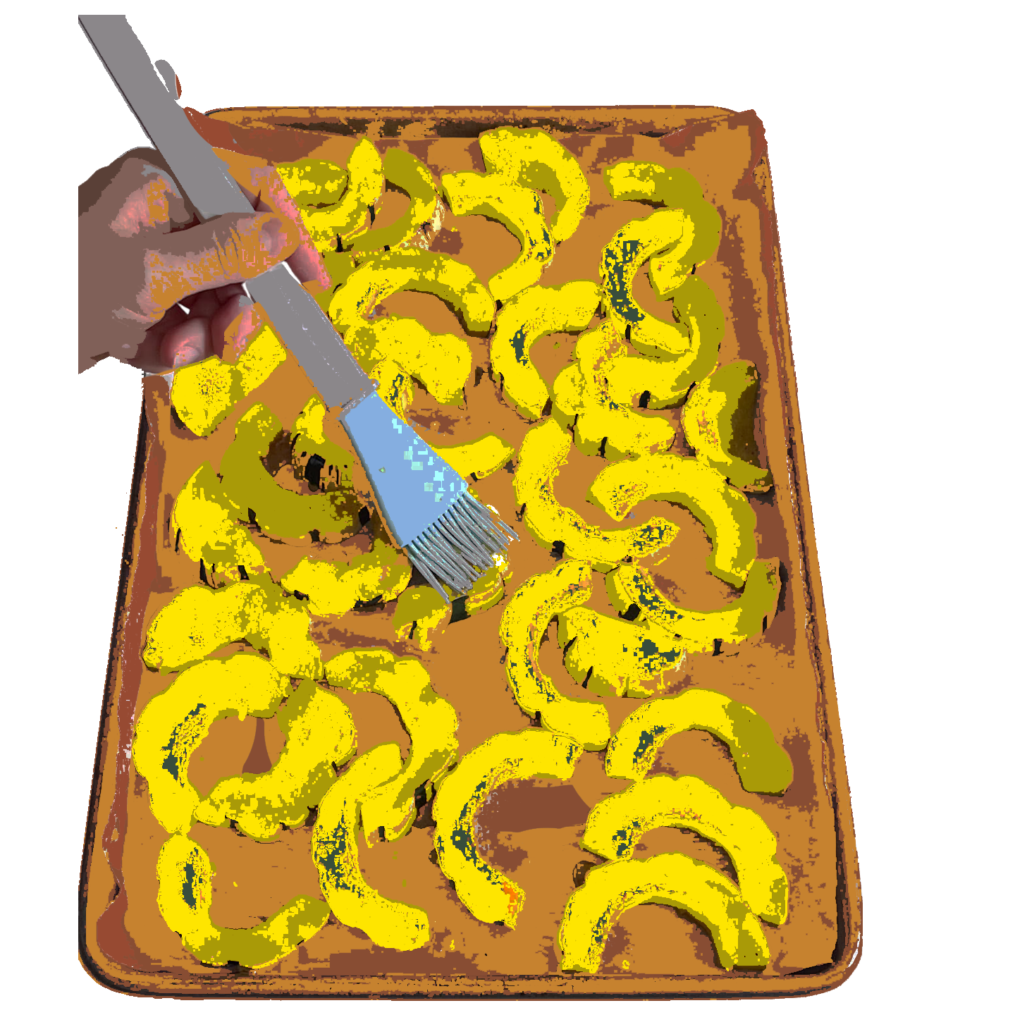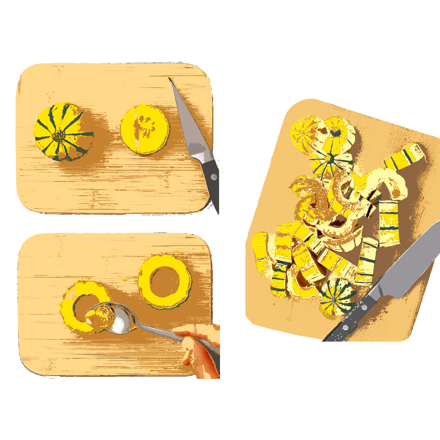 Cut squash in half lengthwise and scoop out the seeds. Cut squash crosswise into ¼-inch slices to form half moons.